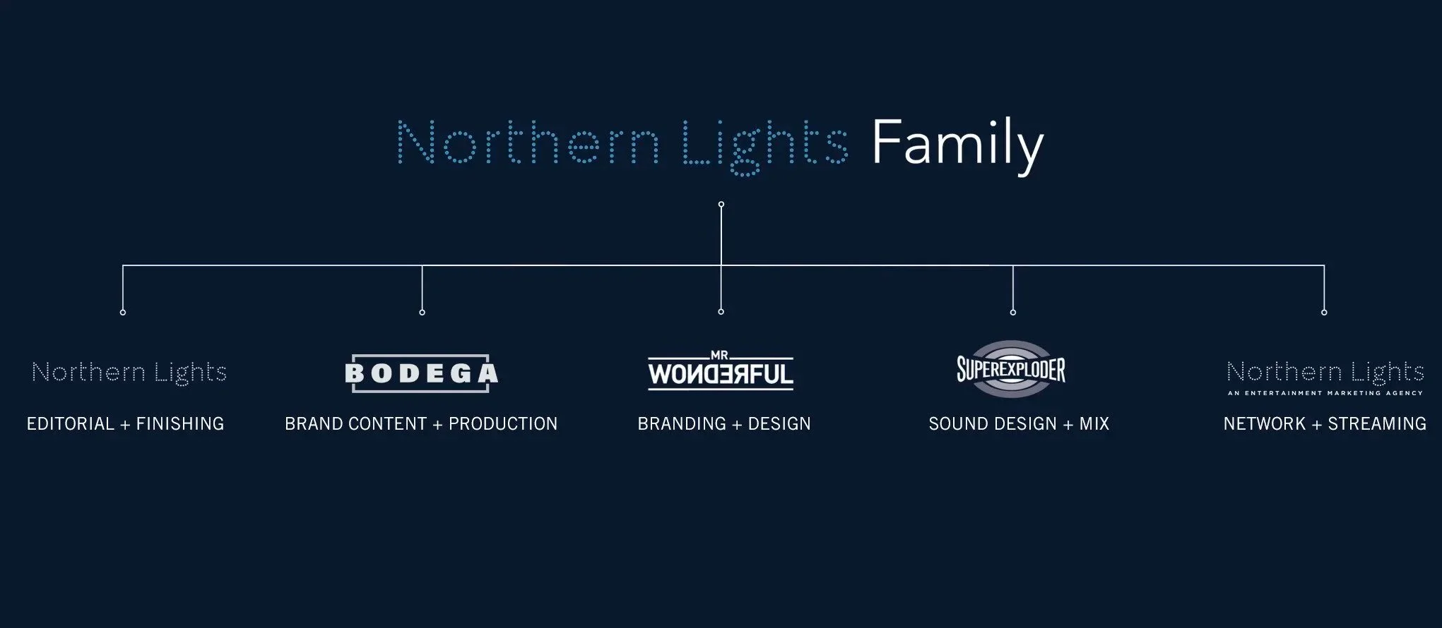Together with our in-house partners Northern Lights for editorial and post, Mr Wonderful for branding and design, SuperExploder for composing, sound design and audio post, BODEGA for production and brand content, and the Northern Lights Agency for networks and streamers entertainment marketing needs, the Northern Lights Family of companies offers award-winning resources under one roof.